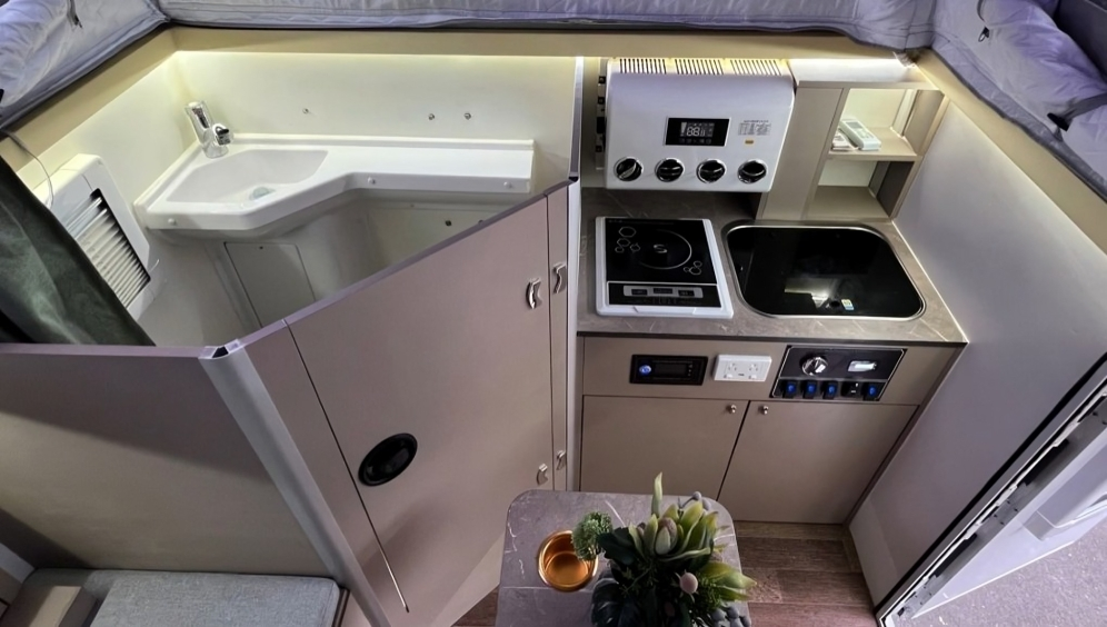 Kitchenette: Prepare delicious meals on the go with the fully-equipped kitchenette. It includes features like a stove, sink, and features ample storage space for all your cooking essentials. No need to compromise on meals while exploring remote areas. You'll have the tools you need to whip up culinary delights.