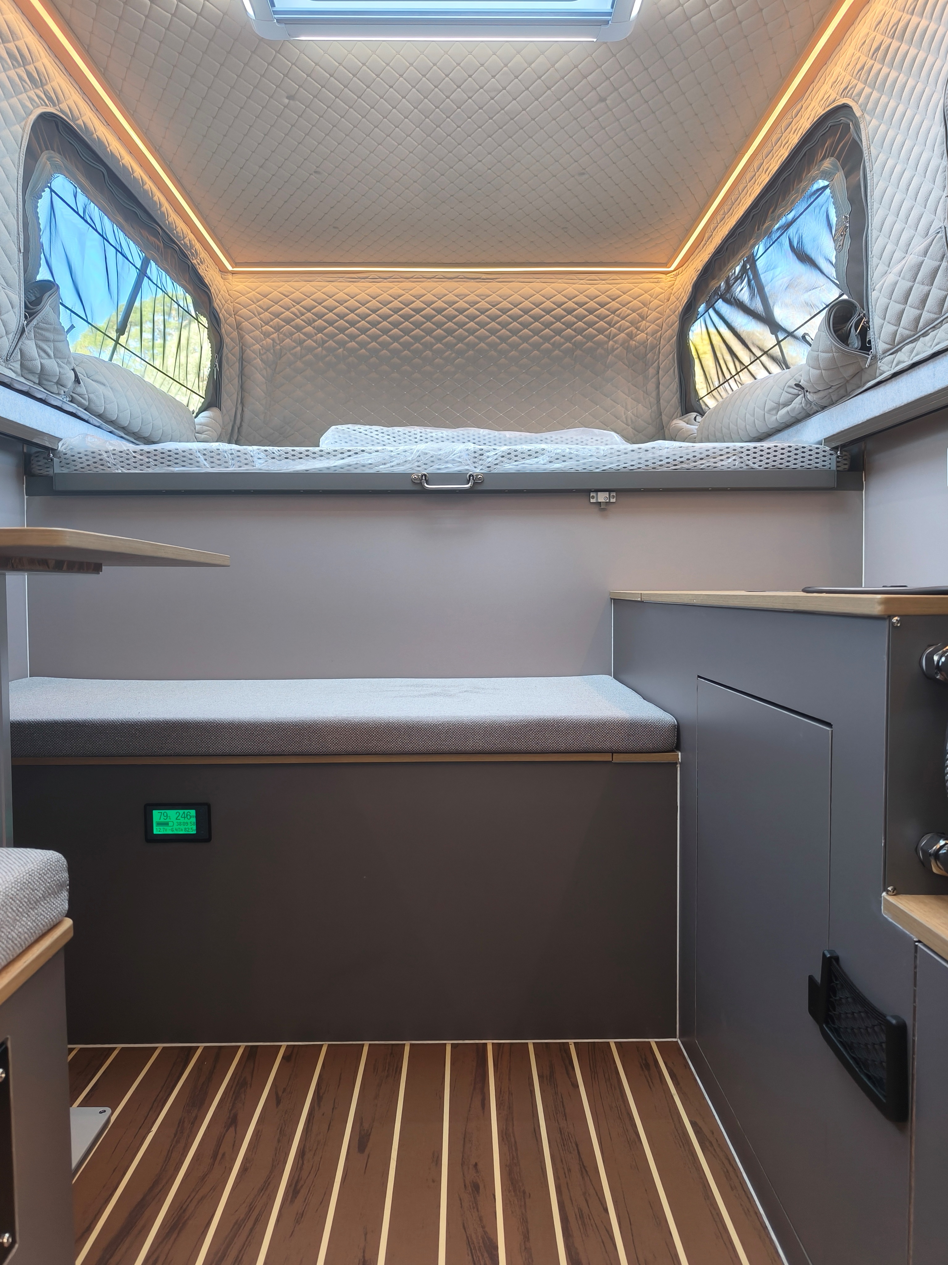 Comfortable Sleeping Area:Our slide-on camper features a cozy and extendable double bed with adjustable LED lights, ensuring you get a good night's rest after a day of adventure. Our campers are designed with your comfort in mind, featuring quality mattresses and clever space and cost-saving solutions. Rest is light and easy, knowing you'll wake up in your motorhome refreshed and ready for the day's exploration.